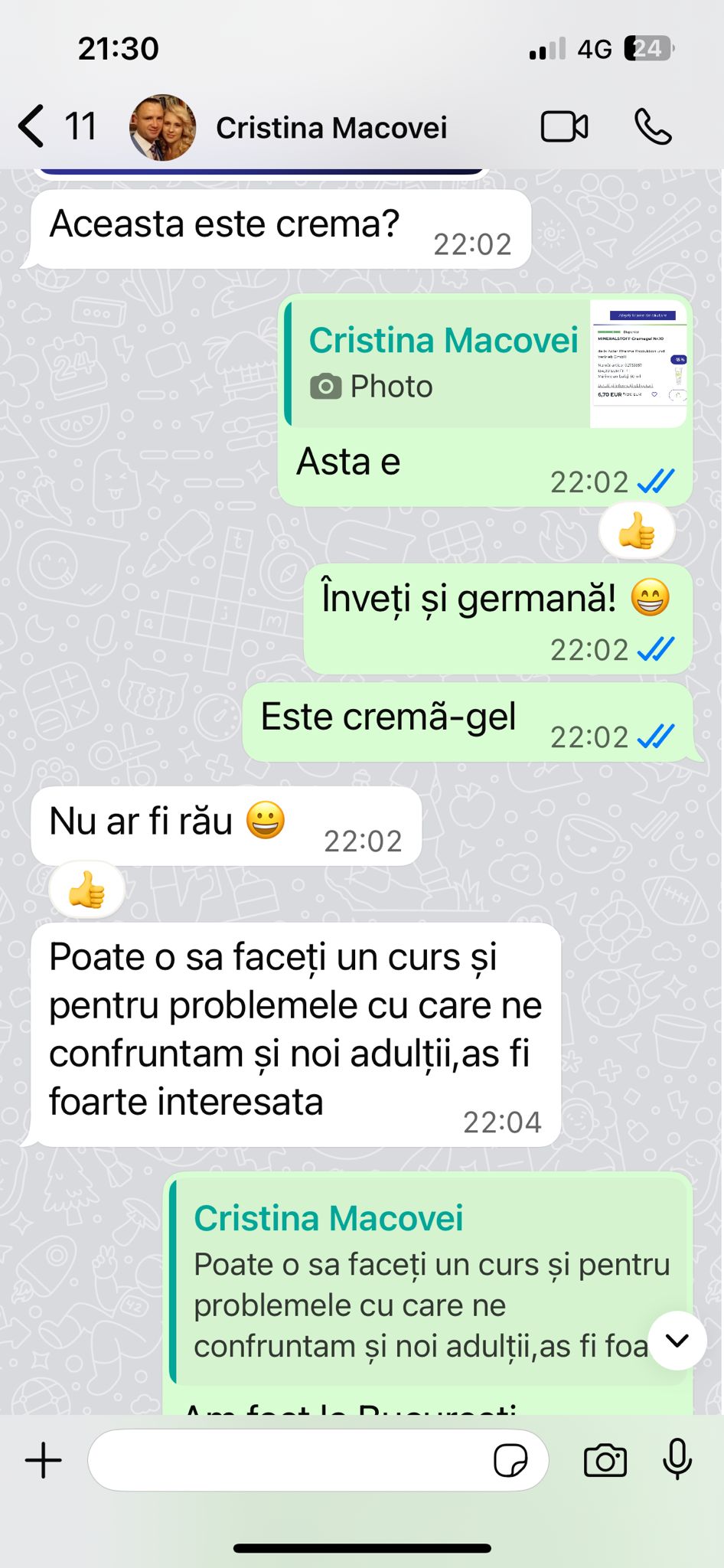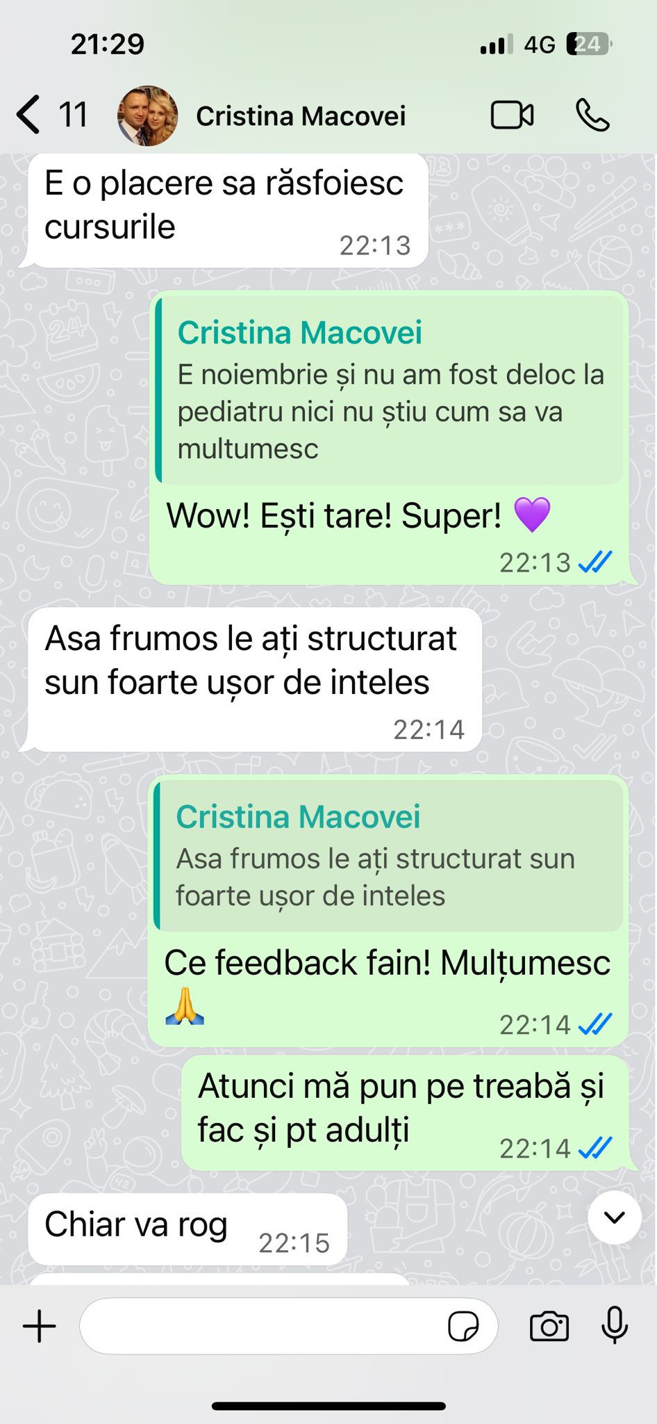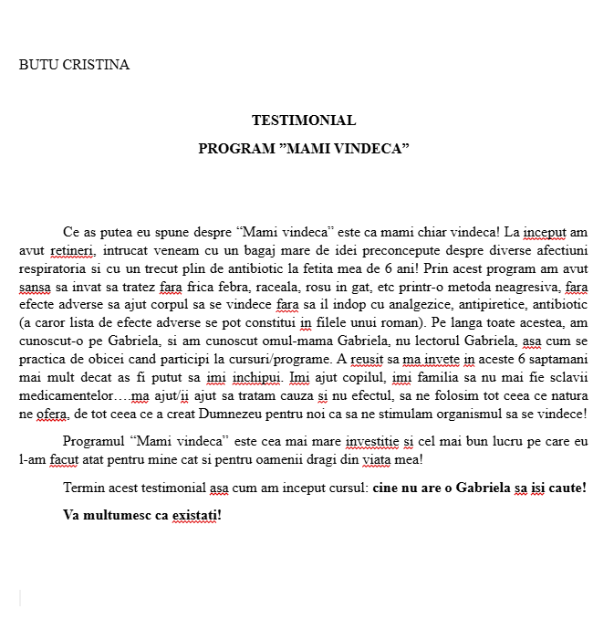 Din dorința de a împărtăși experiențele și cunoștințele mele medicale, am creat cursul „Mami Vindecă”, prin care am ajutat de-a lungul anilor peste 1500 de mame să gestioneze eficient și natural afecțiunile respiratorii și ORL ale copiilor lor. În curs, mamele învață să prevină și să gestioneze viroze, gripe, tuse, febră, otite și alte infecții respiratorii și ORL, folosind medicamente homeopate, săruri Schüssler și remedii naturale sigure și testate, fără reacții adverse și fără panică.